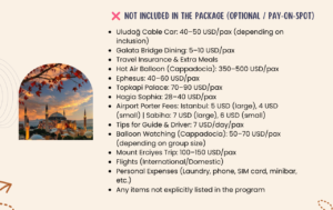 • Balloon Watching (Cappadocia): 50–70 USD/pax (depending on group size)