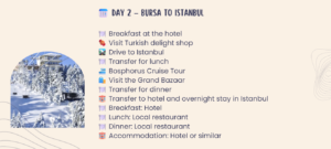Join us on an unforgettable 3-day journey through two of Turkey’s most historic and culturally rich cities — Istanbul and Bursa.
