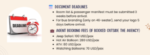 📄 Room list & passenger manifest must be submitted 3 weeks before arrival.